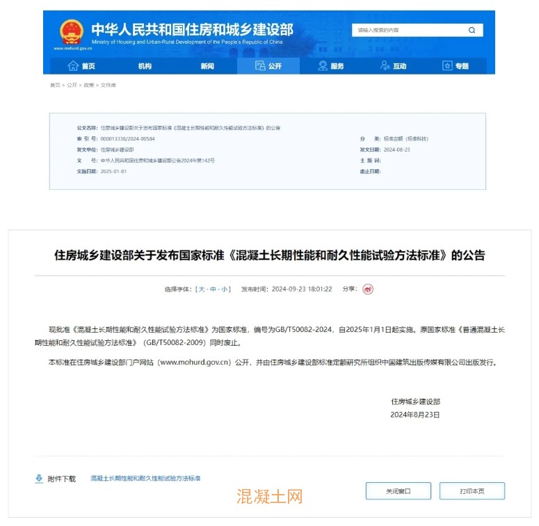 2024年9月23日,住房和城鄉建設部官方網站發布關于國家標準《混凝土長期性能和耐久性能試驗方法標準》的通告,現批準《混凝土長期性能和耐久性能試驗方法標準》為國家標準,編號為GB T 50082—2024,自2025年1月1日起實施。
